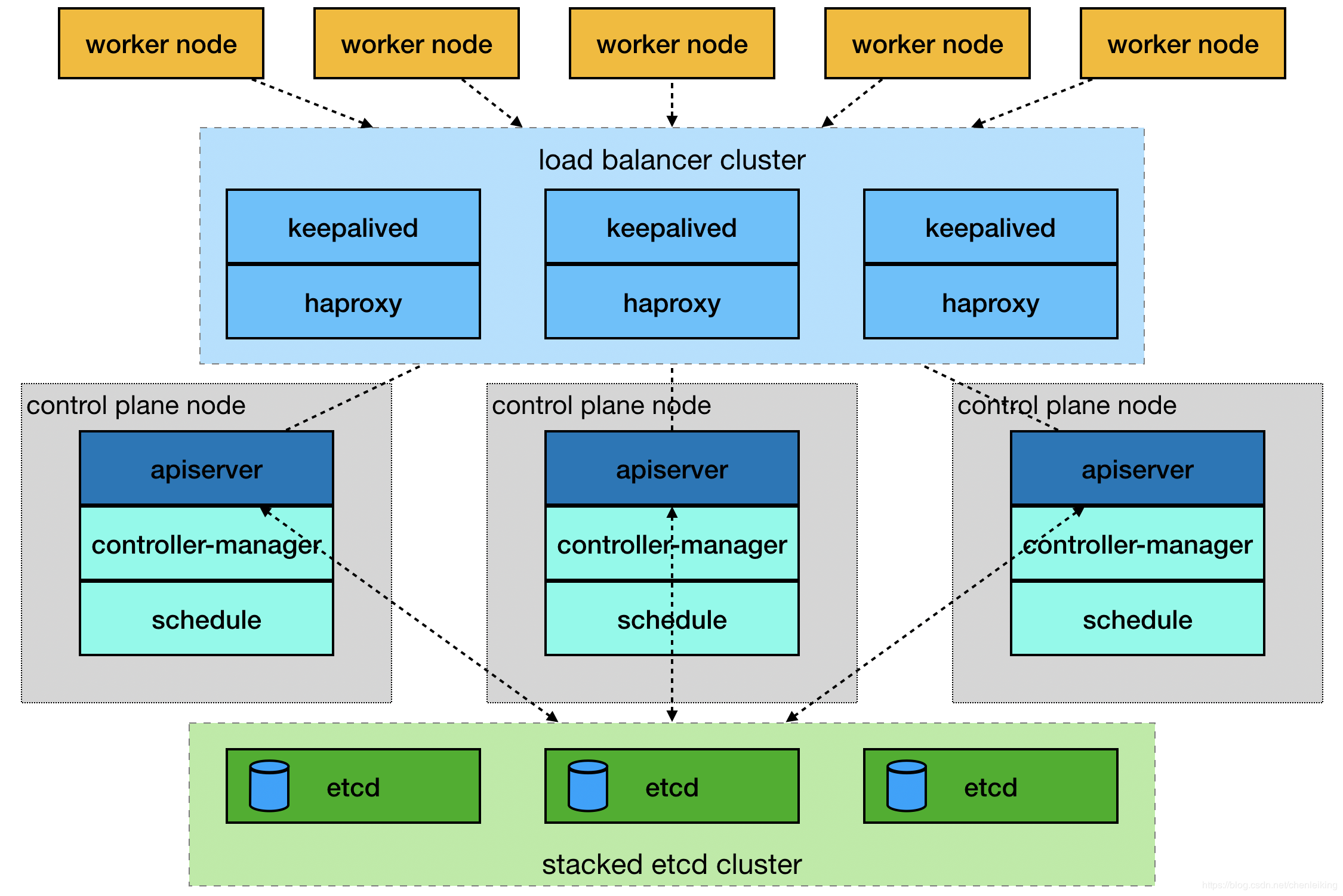 官网 提供了两种拓扑结构部署集群:stacked control plane nodes 和external etcd cluster ,本文基于第一种拓扑结构进行部署,使用Keepalived + HAProxy 搭建高可用Load balancer 。